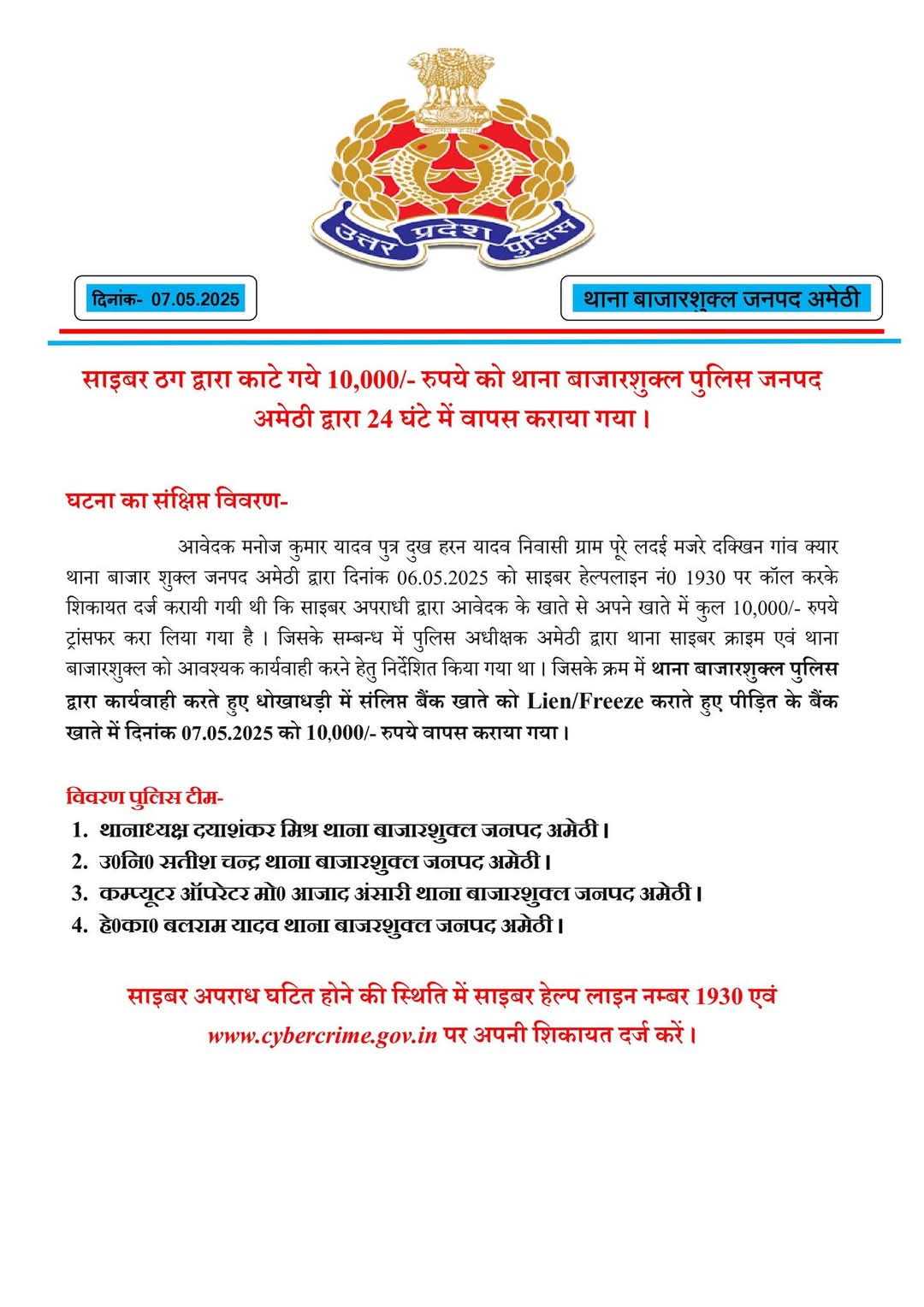 मनोज कुमार यादव ग्राम पूरे लदई, दक्खिन गांव क्यार के रहने वाले हैं। उन्होंने 6 मई 2025 को साइबर हेल्पलाइन 1930 पर शिकायत दर्ज कराई। पुलिस अधीक्षक अमेठी ने तुरंत साइबर क्राइम और बाजारशुक्ल थाना पुलिस को कार्रवाई के निर्देश दिए।